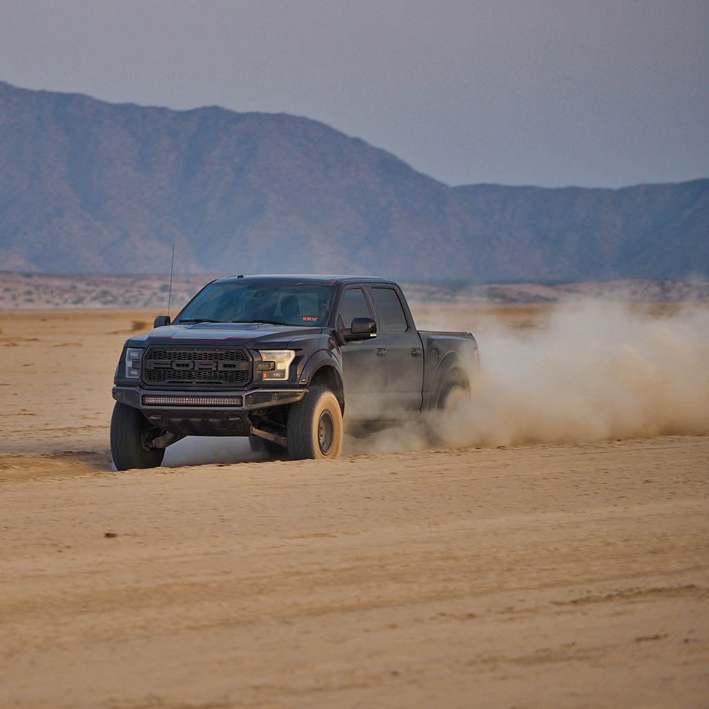 Fox Factory Race Series shocks for the Gen 2 Ford Raptor are no joke. The front 3.0 Internal Bypass Coilovers feature a unique Recirculating Reservoir Bridge and finned remote reservoirs keeping the shocks cool no matter how hard you run them. DSC adjusters are included for fine-tuning high- and low-speed compression. The coilovers come preset from the factory to level the Raptor right out of the box but are also adjustable. A heavily-finned remote reservoir and Fox's Recirculating Reservoir Bridge keeps temperatures in check and shock fade at bay. Three external bypass tubes with Fox's Quick Adjust Bypass clickers make adjusting compression and rebound a simple process. Both front and rear shocks use bypass technology, giving a supple ride in normal terrain and considerably ramp up damping force when the going gets rough. Fox's Factory Race Series shocks will add even more capability to your Ford Raptor.